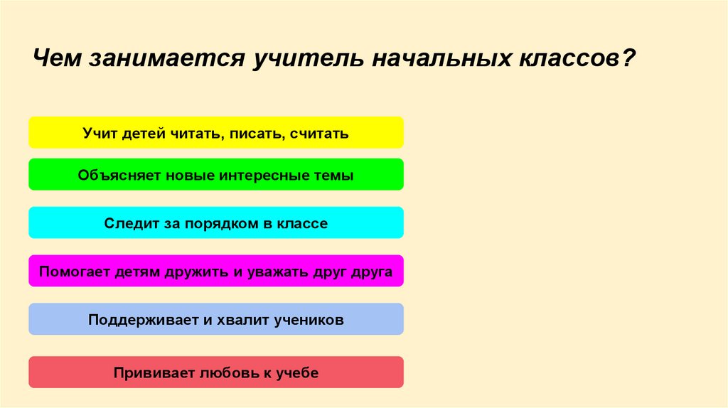 Чем занимается учитель начальных классов?Учит детей читать, писать, считать