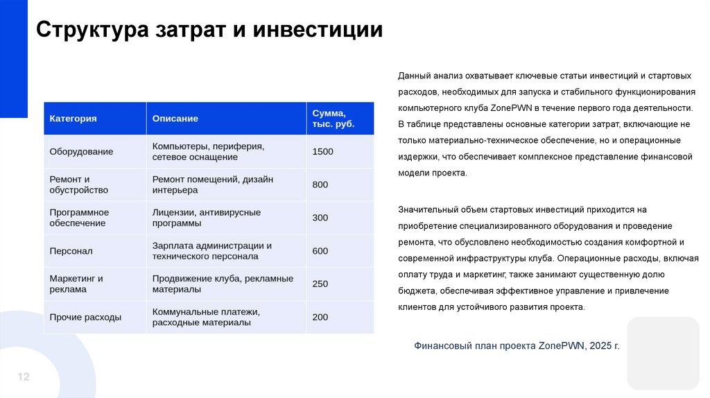 Структура затрат и инвестицииДанный анализ охватывает ключевые статьи инвестиций и стартовых