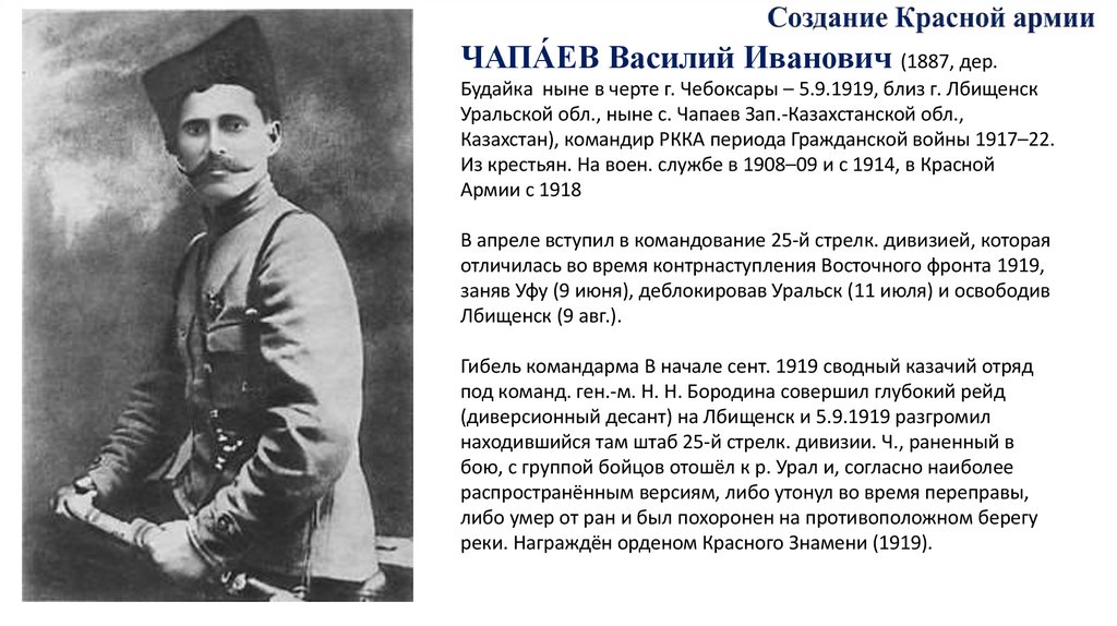 ЧАПА́ЕВ Василий Иванович (1887, дер.Будайка ныне в черте г. Чебоксары – 5.9.1919, близ г. Лбищенск