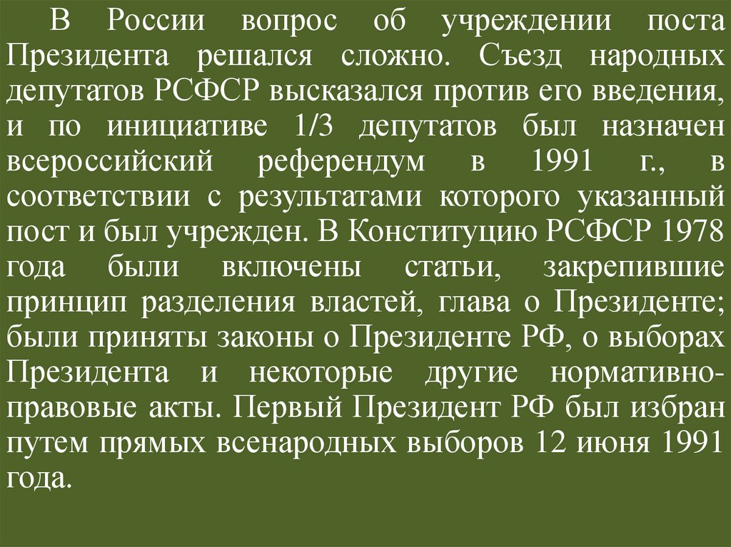 В Конституции РСФСР 1978 года Президент характеризовался как высшее