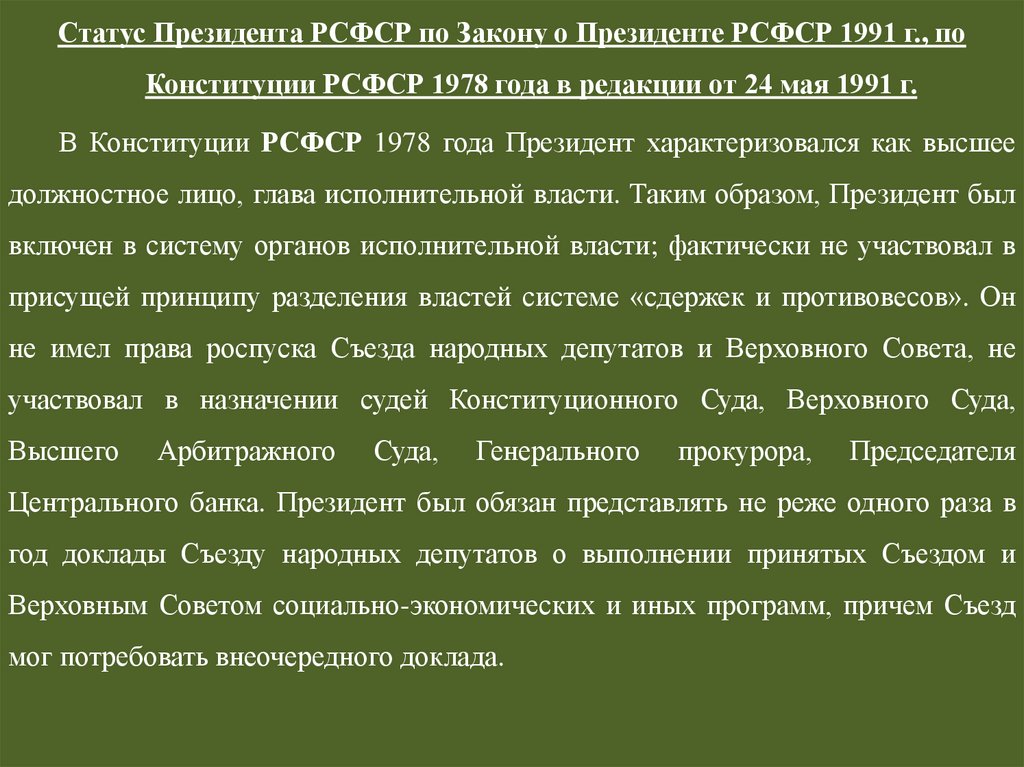 Статус Президента РСФСР по Закону о Президенте РСФСР 1991 г., поКонституции РСФСР 1978 года в редакции от 24 мая 1991 г.