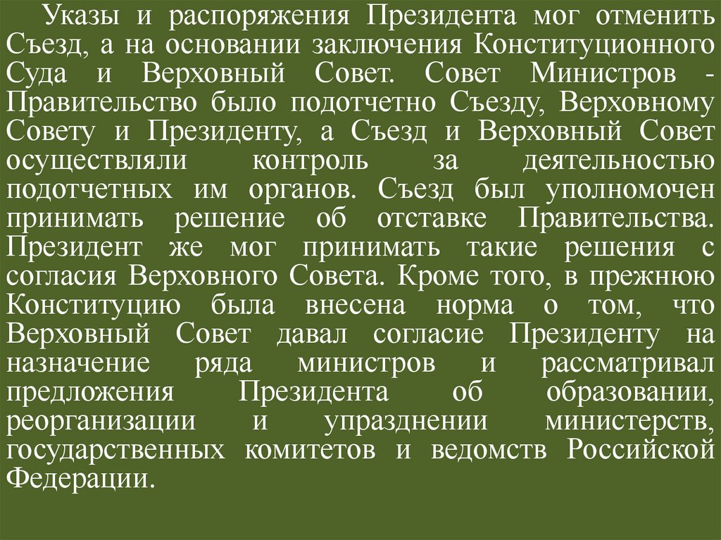 Указы и распоряжения Президента мог отменитьСъезд, а на основании заключения Конституционного
