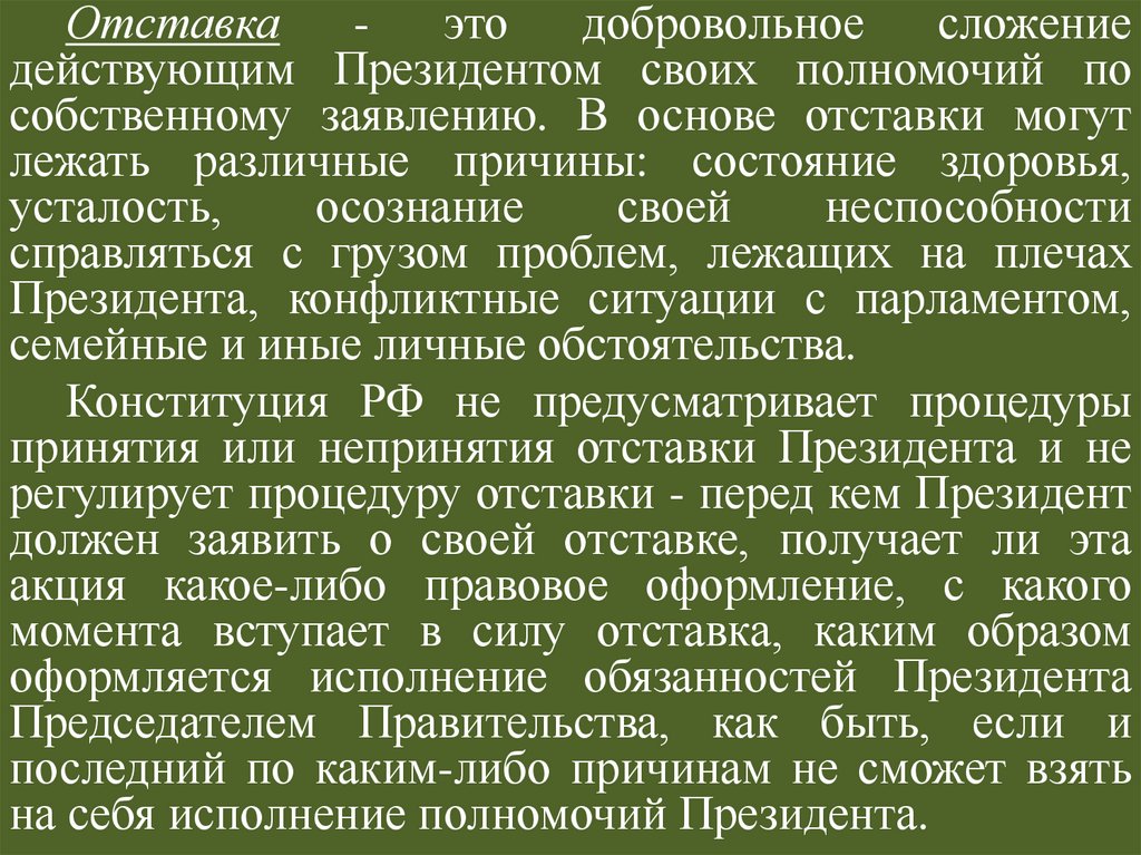 регулирует процедуру отставки - перед кем Президент
