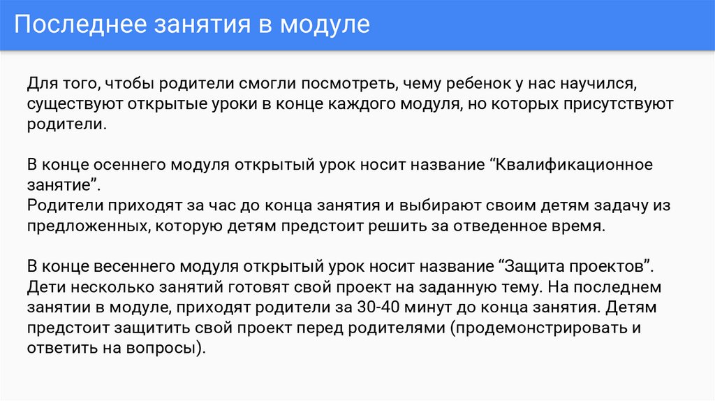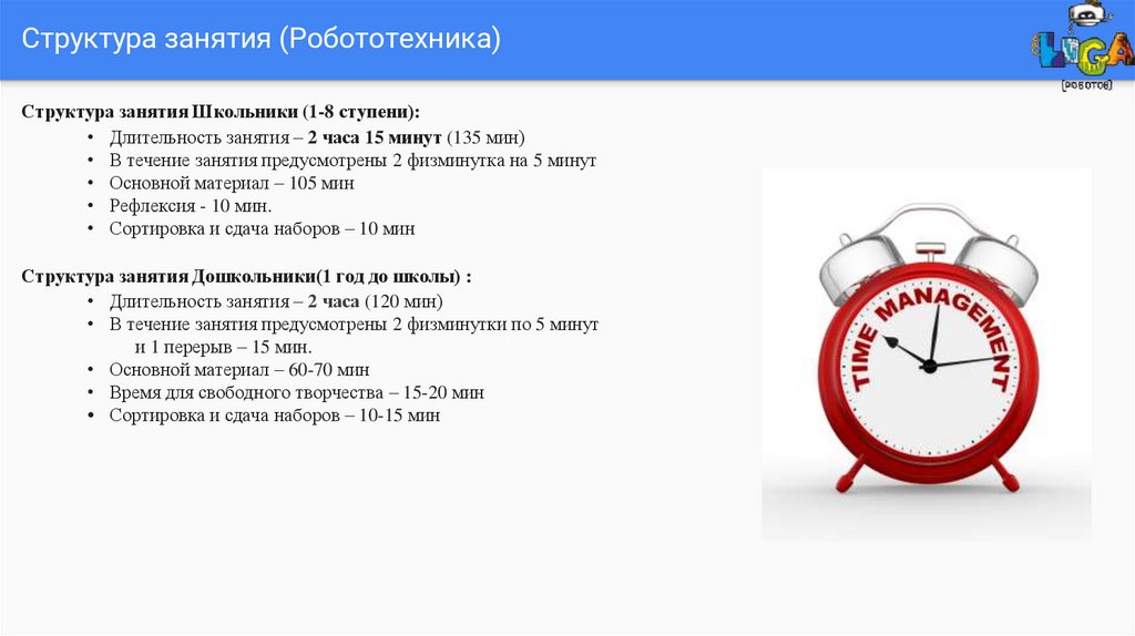 • Длительность занятия – 2 часа 15 минут (135 мин)