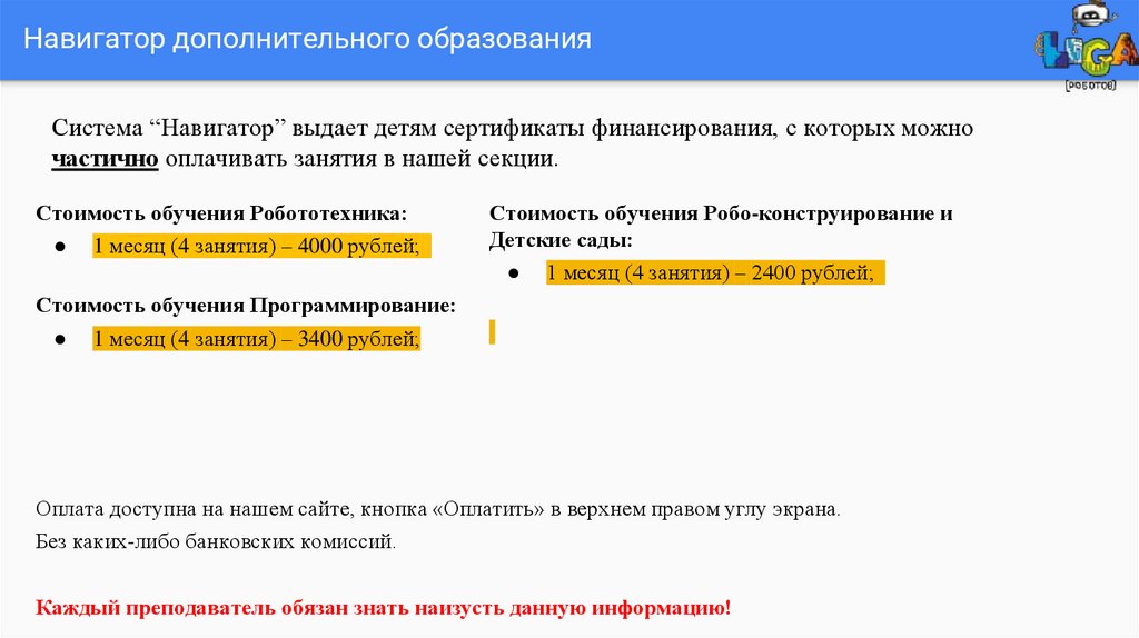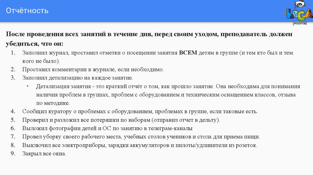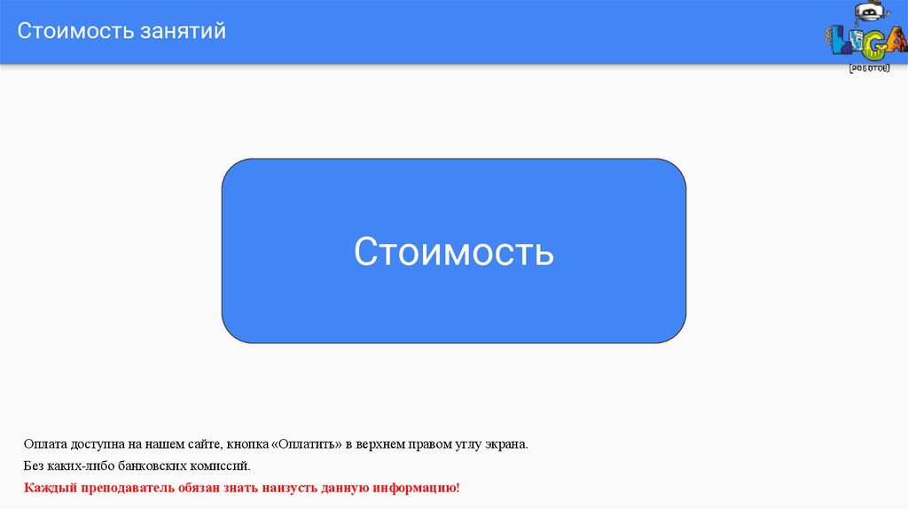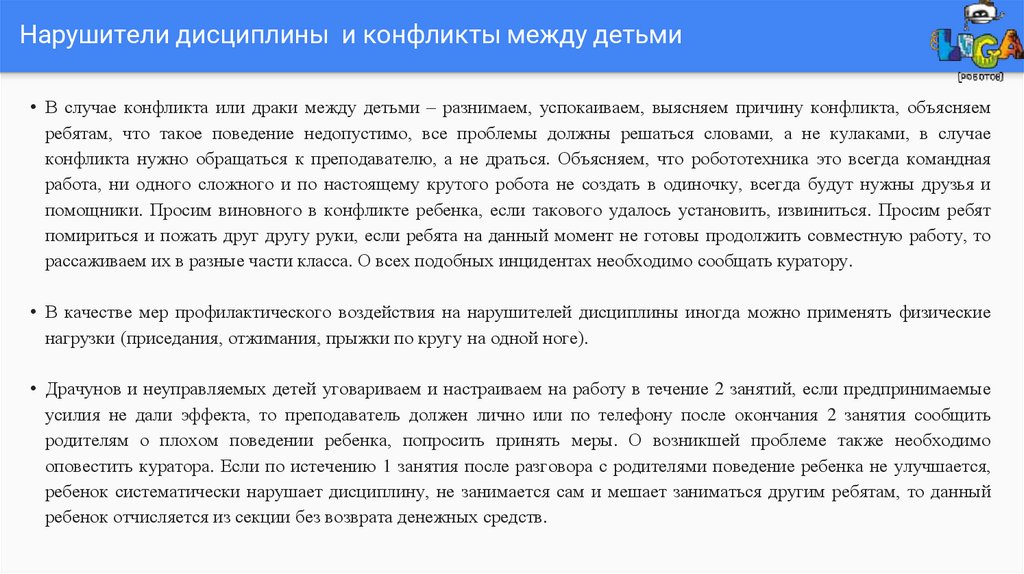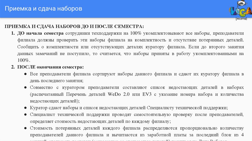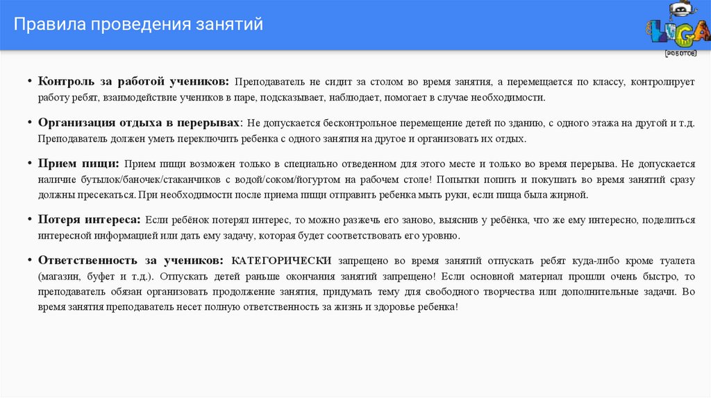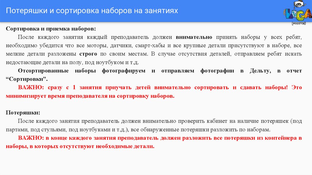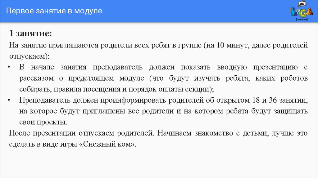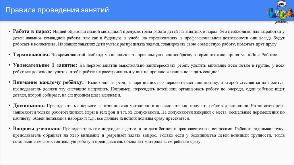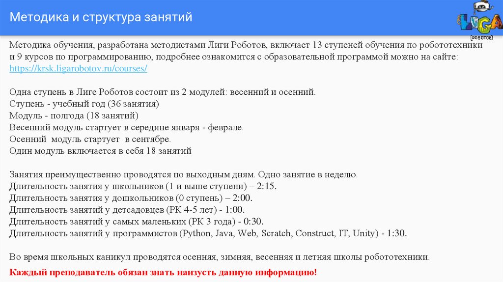 Методика и структура занятийМетодика обучения, разработана методистами Лиги Роботов, включает 13 ступеней обучения по робототехники