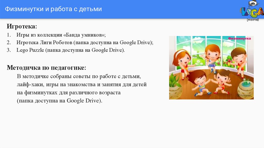 • В течение занятия предусмотрены 2 физминутка на 5 минут