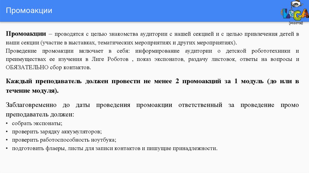 Проведение промоакции включает в себя: информирование аудитории о детской робототехники и