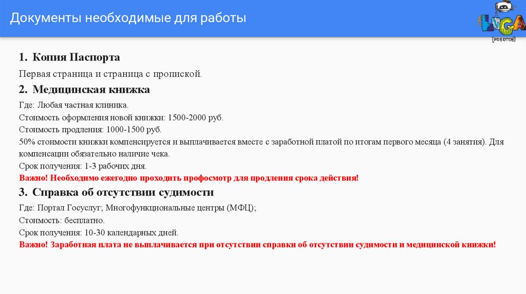Важно! Заработная плата не выплачивается при отсутствии справки об отсутствии судимости и медицинской книжки!