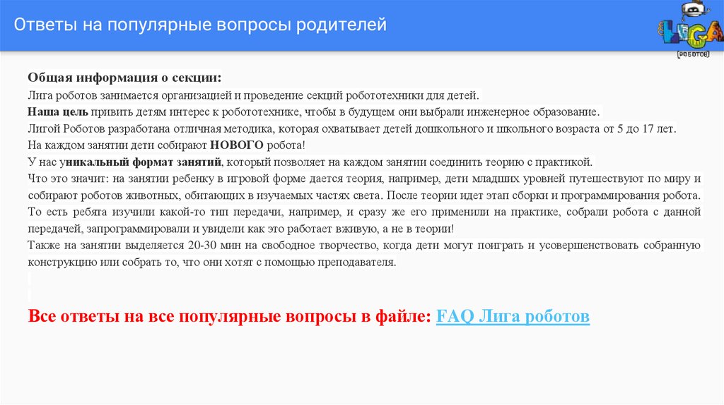 Все ответы на все популярные вопросы в файле: FAQ Лига роботов