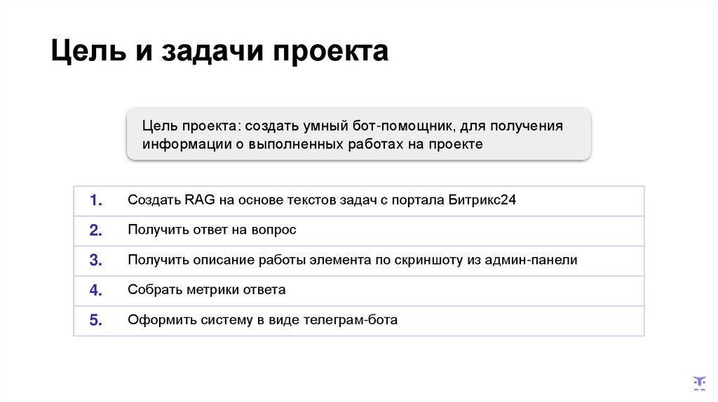 Цель и задачи проектаЦель проекта: создать умный бот-помощник, для получения
