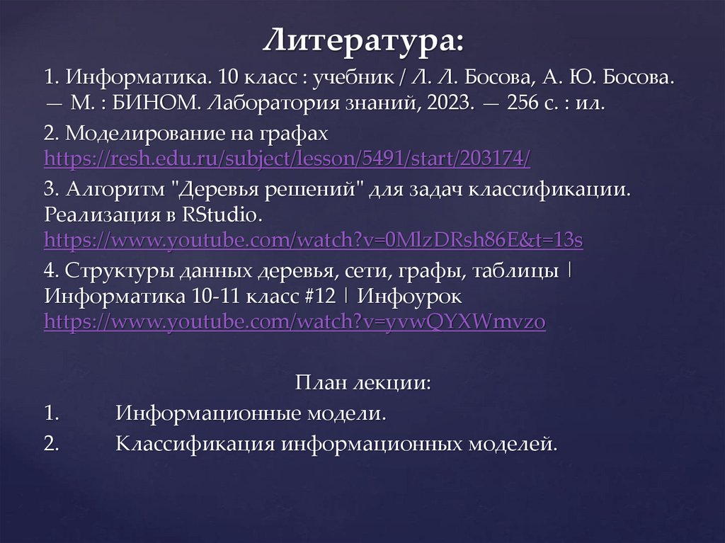 Литература:1. Информатика. 10 класс : учебник / Л. Л. Босова, А. Ю. Босова.