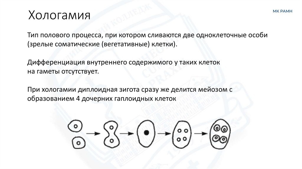 При хологамии диплоидная зигота сразу же делится мейозом с