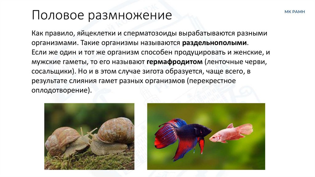 Половое размножениеКак правило, яйцеклетки и сперматозоиды вырабатываются разными