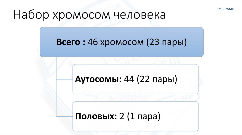 Набор хромосом человекаВсего : 46 хромосом (23 пары)