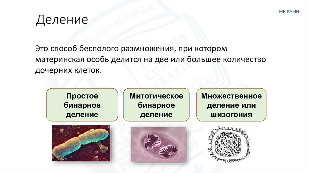Наиболее распространено бесполое размножение у бактерий, грибов ирастений, встречается и у животных. Существует несколько способов