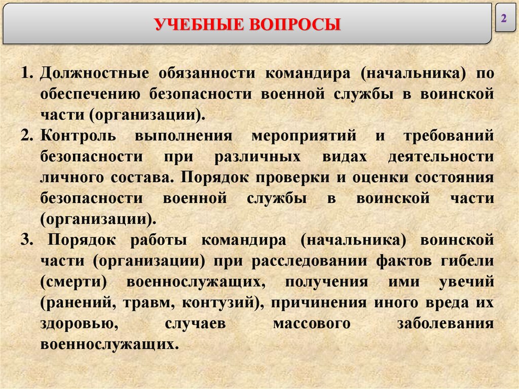 УЧЕБНЫЕ ВОПРОСЫ1. Должностные обязанности командира (начальника) по