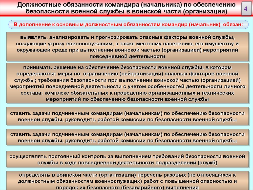 Должностные обязанности командира (начальника) по обеспечениюбезопасности военной службы в воинской части (организации)