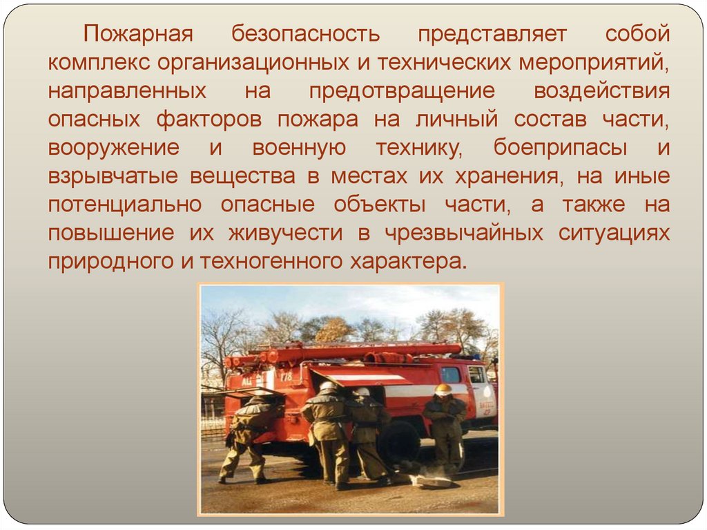 - обеспечение пожарной безопасности вооружения и военной техники,