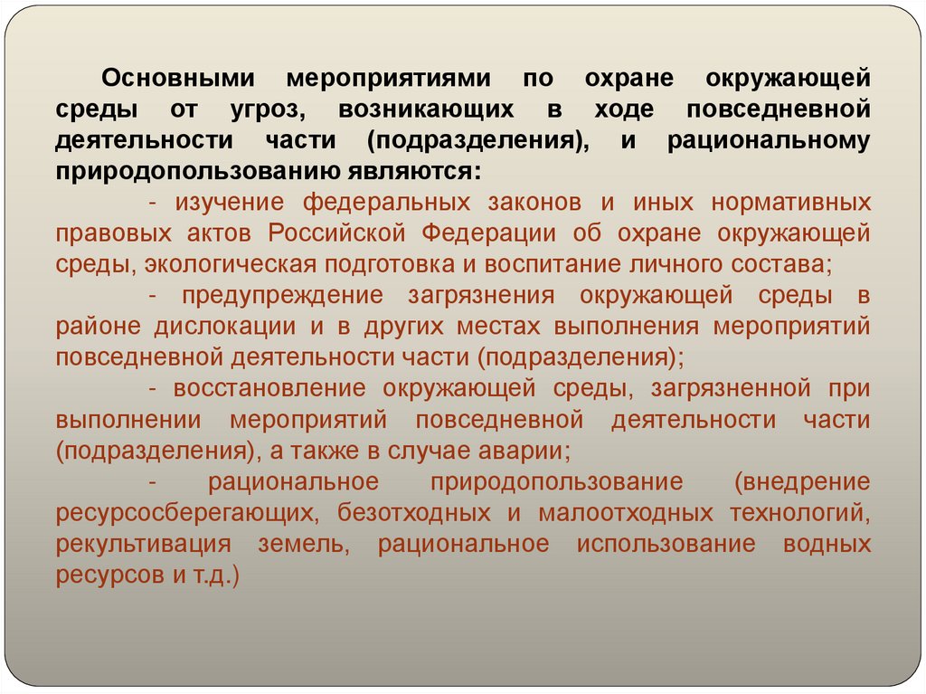Основными мероприятиями по охране окружающейсреды от угроз, возникающих в ходе повседневной