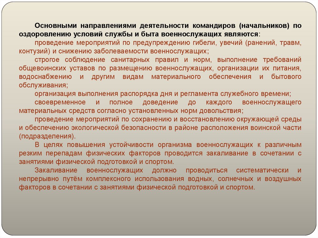 Основными направлениями деятельности командиров (начальников) пооздоровлению условий службы и быта военнослужащих являются: