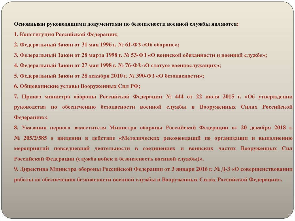 Основными руководящими документами по безопасности военной службы являются:1. Конституция Российской Федерации;
