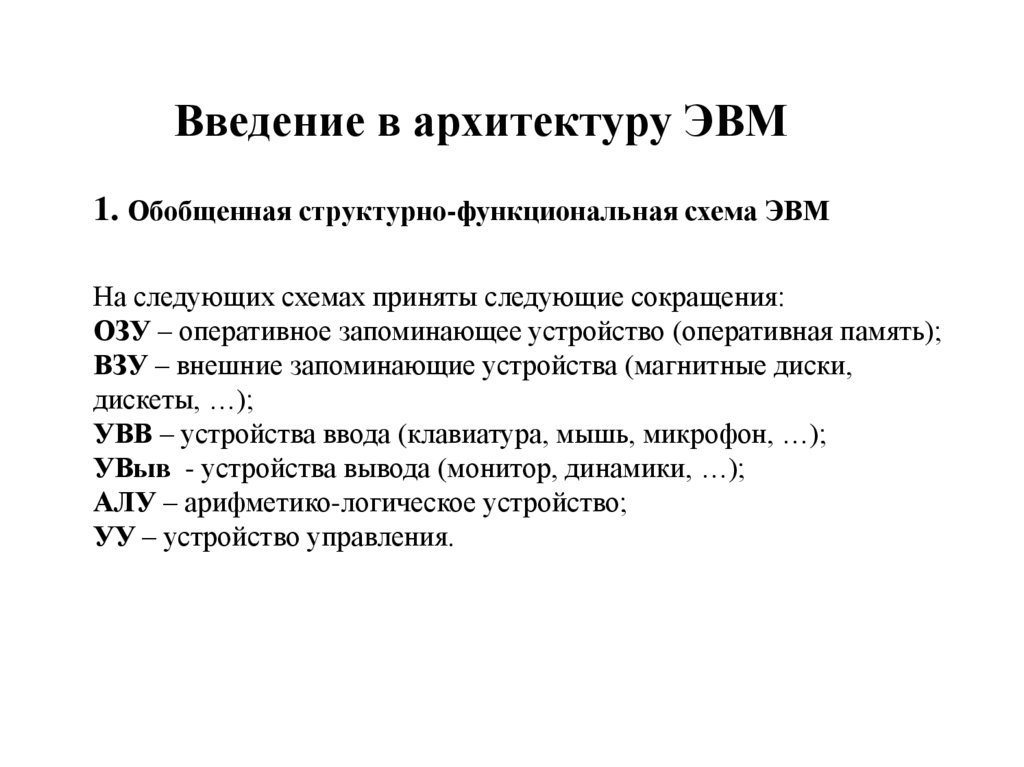 1. Введение в архитектуру ЭВМ 1. Обобщенная структурно-функциональная схема ЭВМ На следующих схемах приняты следующие сокращения:
