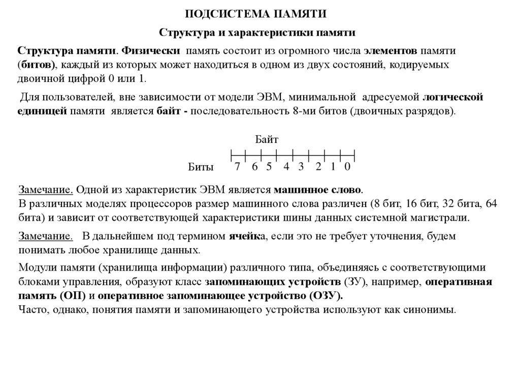 ПОДСИСТЕМА ПАМЯТИСтруктура и характеристики памяти