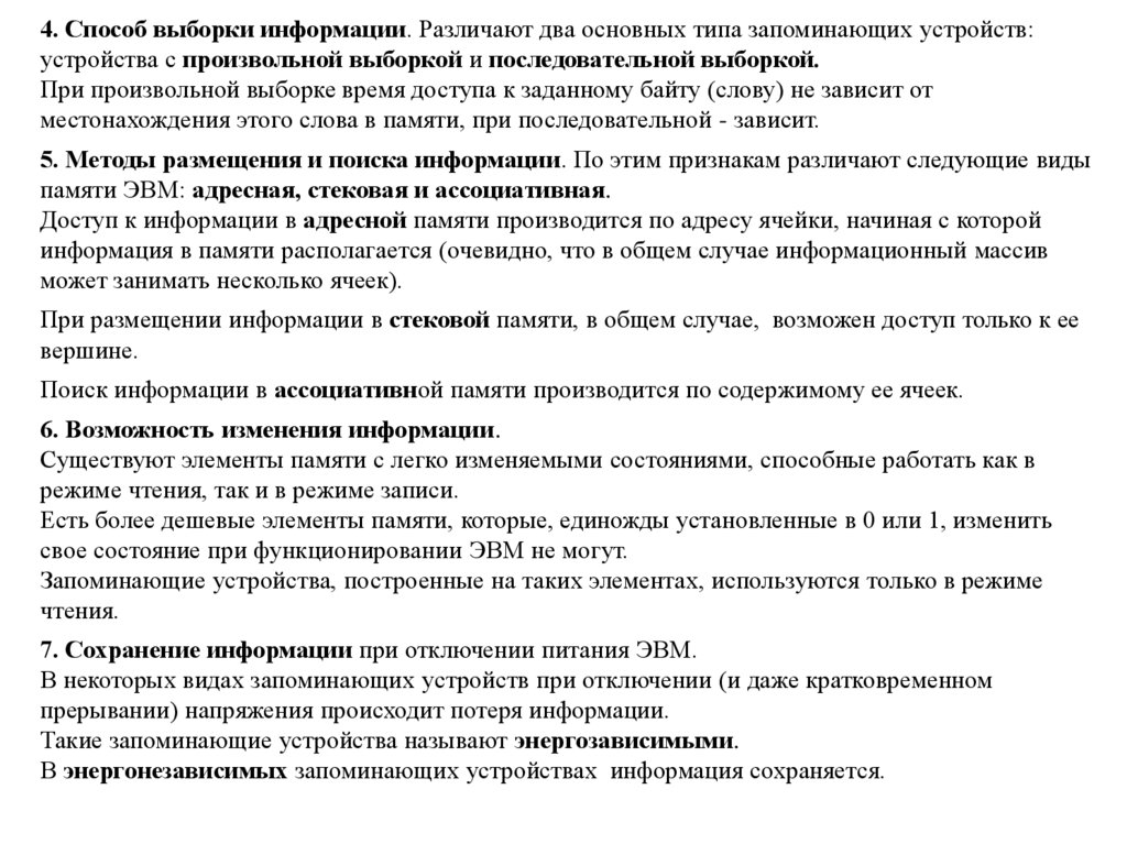 4. Способ выборки информации. Различают два основных типа запоминающих устройств:устройства с произвольной выборкой и последовательной выборкой.