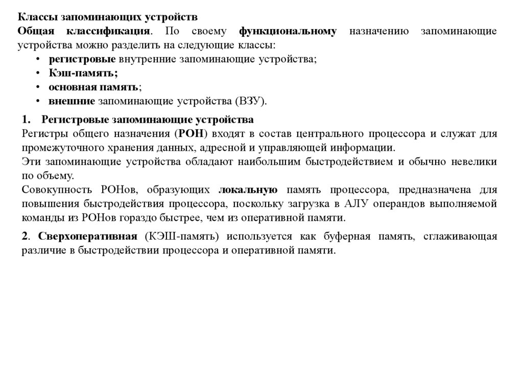 Классы запоминающих устройствОбщая классификация. По своему функциональному