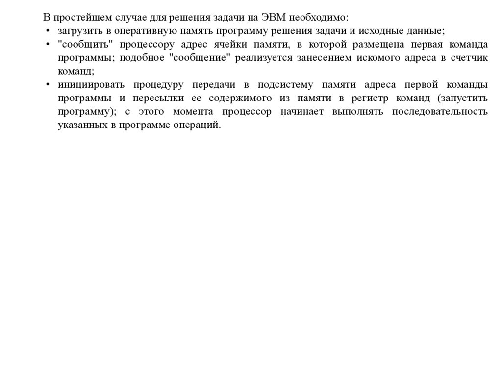 В простейшем случае для решения задачи на ЭВМ необходимо:• загрузить в оперативную память программу решения задачи и исходные данные;