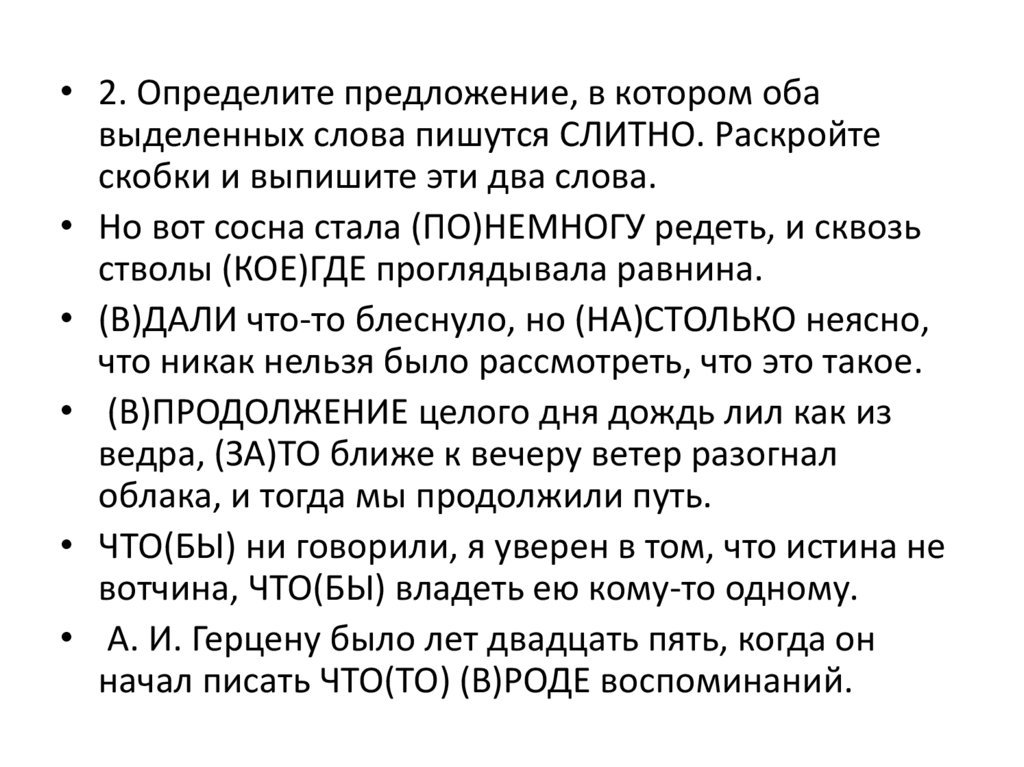 • 2. Определите предложение, в котором обавыделенных слова пишутся СЛИТНО. Раскройте