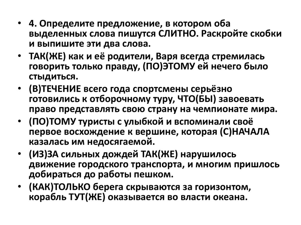 • 4. Определите предложение, в котором обавыделенных слова пишутся СЛИТНО. Раскройте скобки