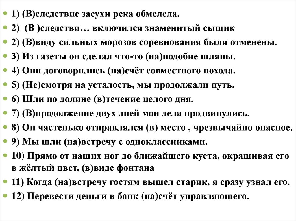 1) (В)следствие засухи река обмелела.2) (В )следстви… включился знаменитый сыщик