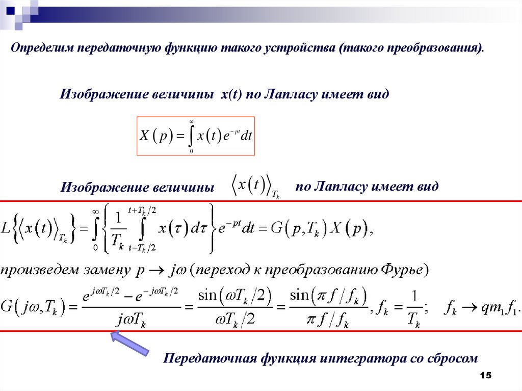 Определим передаточную функцию такого устройства (такого преобразования).Изображение величины x(t) по Лапласу имеет вид