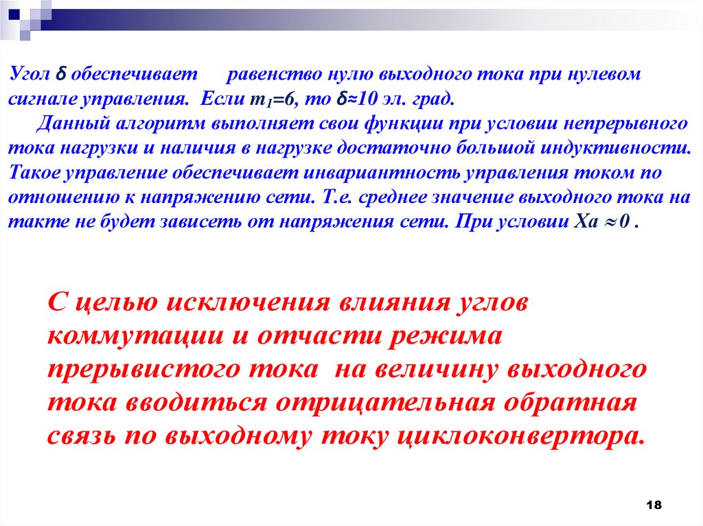 Угол δ обеспечиваетравенство нулю выходного тока при нулевом