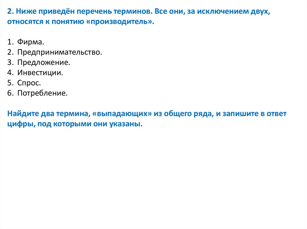 2. Ниже приведён перечень терминов. Все они, за исключением двух,относятся к понятию «производитель».