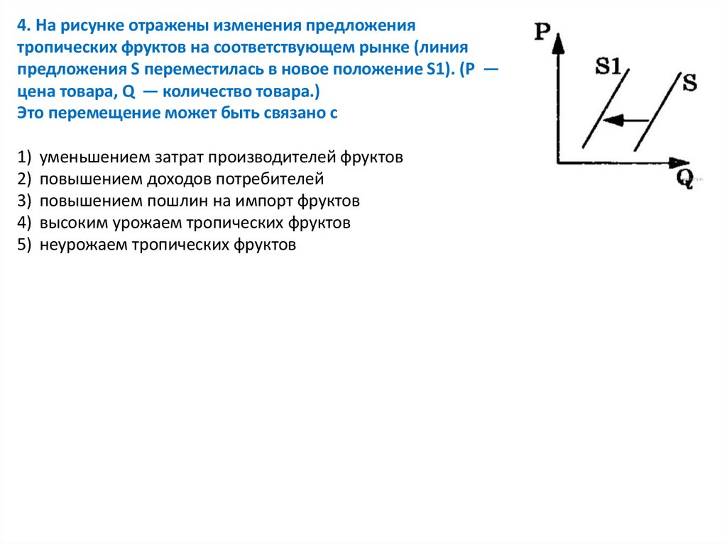 4. На рисунке отражены изменения предложениятропических фруктов на соответствующем рынке (линия