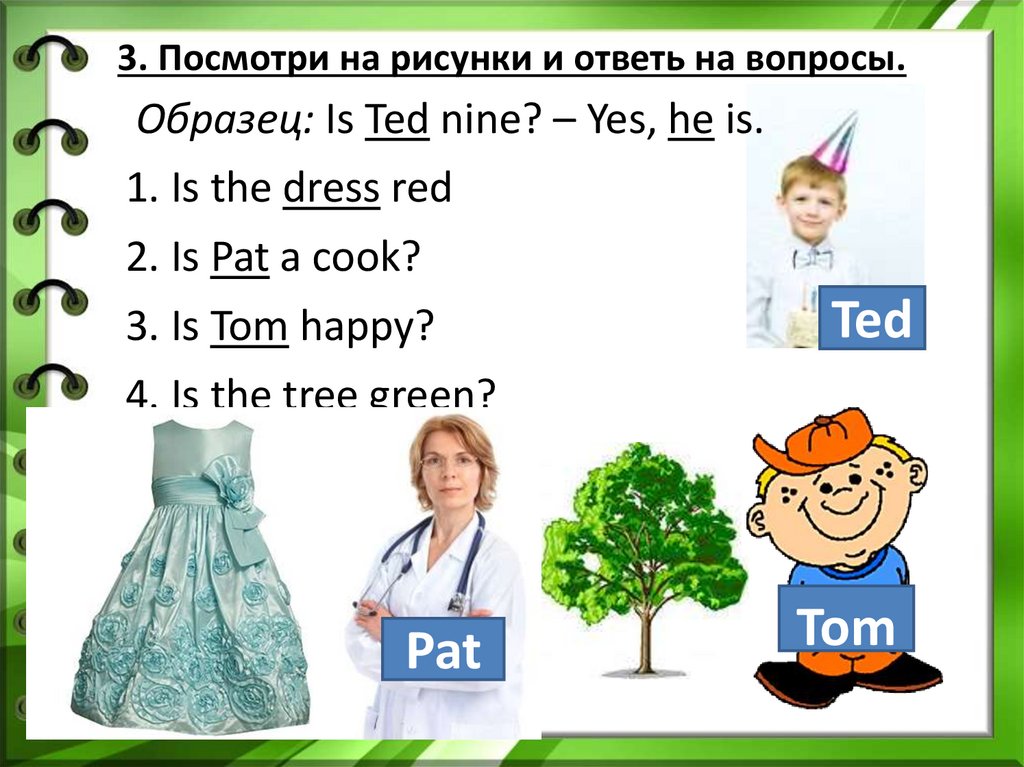 3. Посмотри на рисунки и ответь на вопросы.Образец: Is Ted nine? – Yes, he is.