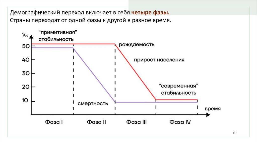 Демографический переход включает в себя четыре фазы.Страны переходят от одной фазы к другой в разное время.