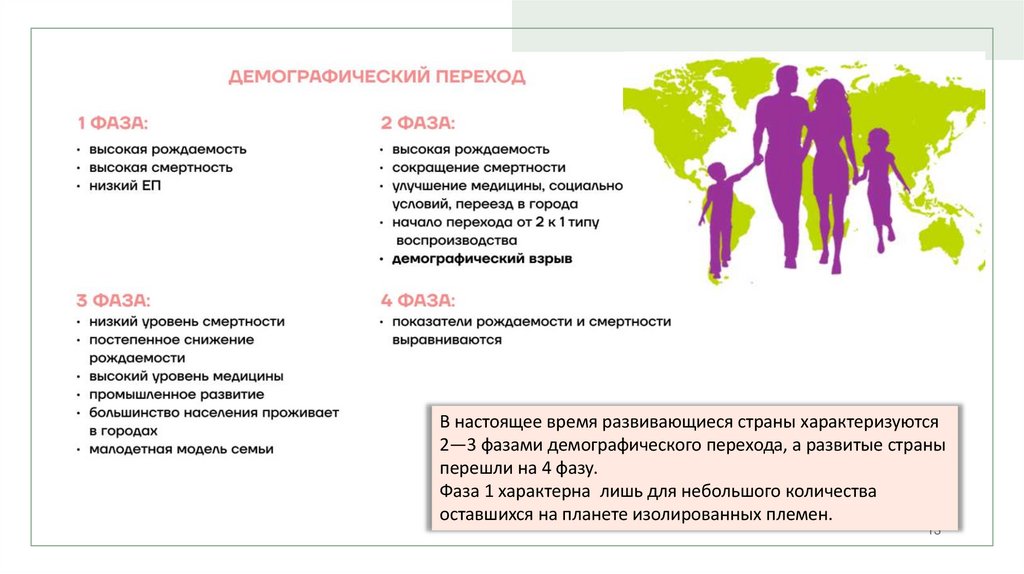 В настоящее время развивающиеся страны характеризуются2—3 фазами демографического перехода, а развитые страны