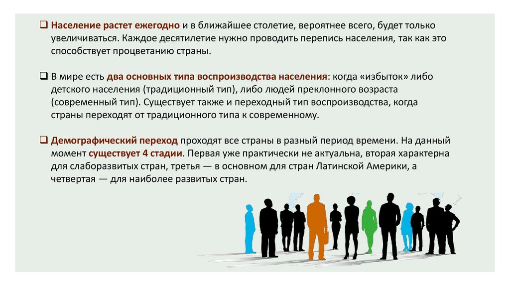 Население растет ежегодно и в ближайшее столетие, вероятнее всего, будет толькоувеличиваться. Каждое десятилетие нужно проводить перепись населения, так как это