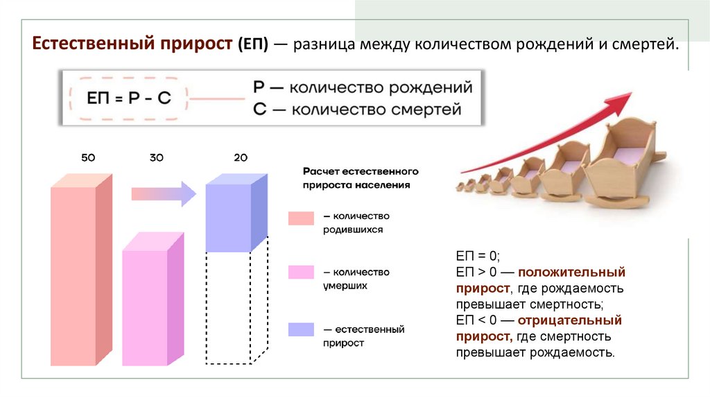 Естественный прирост (ЕП) — разница между количеством рождений и смертей.ЕП = 0;