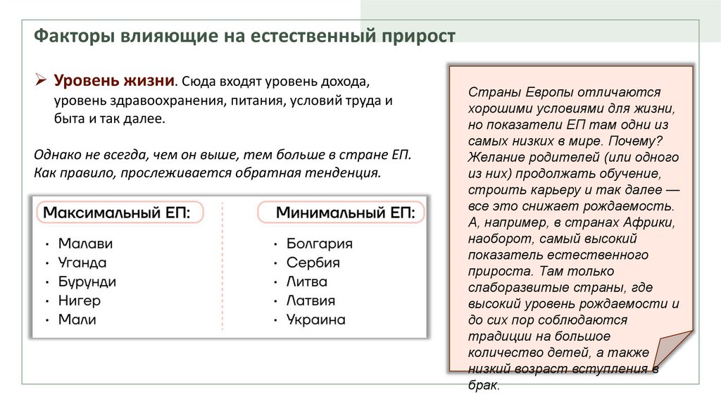 Факторы влияющие на естественный приростУровень жизни. Сюда входят уровень дохода,
