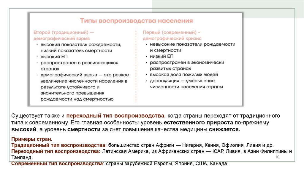 Существует также и переходный тип воспроизводства, когда страны переходят от традиционноготипа к современному. Его главная особенность: уровень естественного прироста по-прежнему