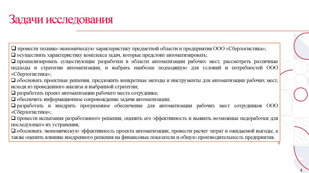 Задачи исследованияпровести технико-экономическую характеристику предметной области и предприятия ООО «Сберлогистика»;
