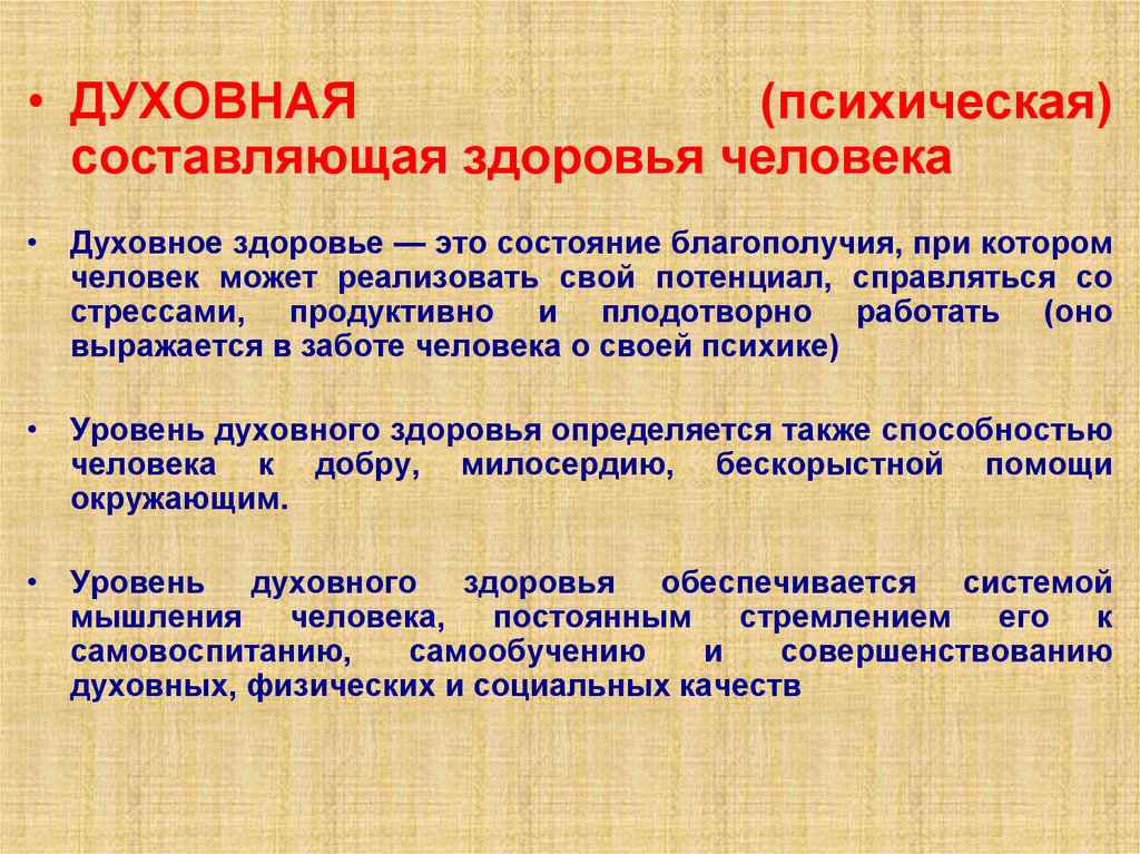 • Духовное здоровье — это состояние благополучия, при котором