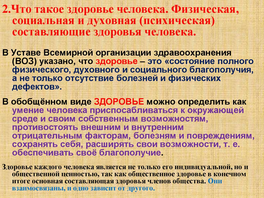2.Что такое здоровье человека. Физическая,социальная и духовная (психическая)