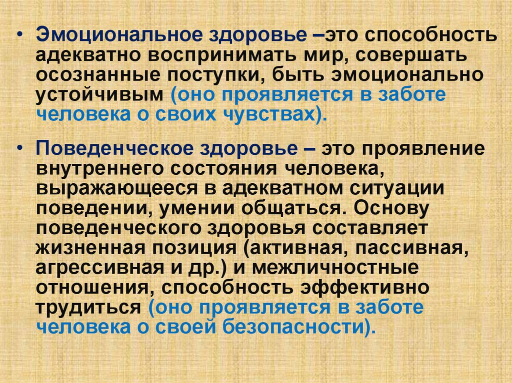 • Поведенческое здоровье – это проявление