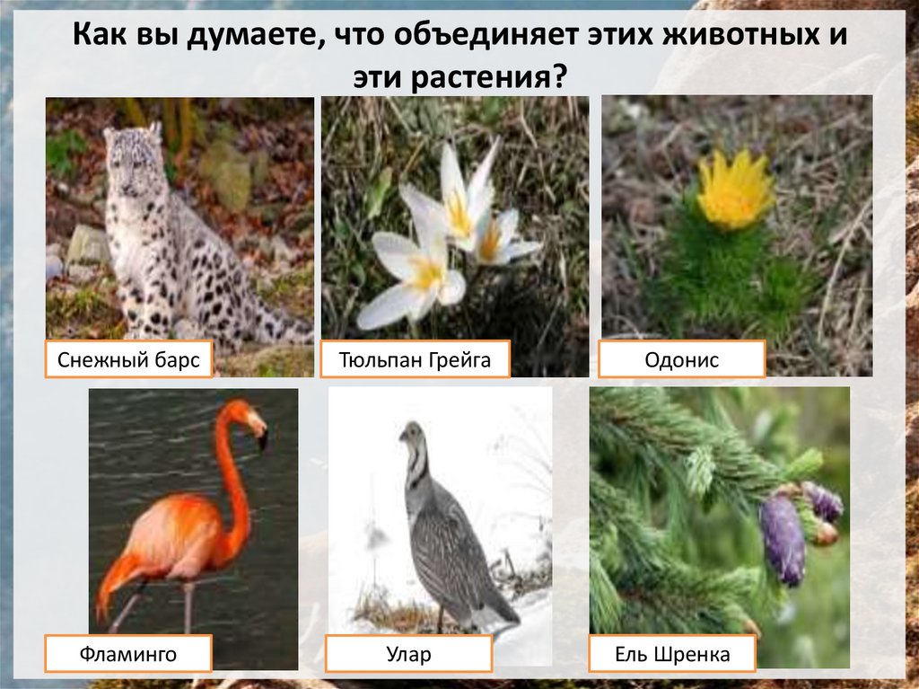 1. Как вы думаете, что объединяет этих животных и эти растения?