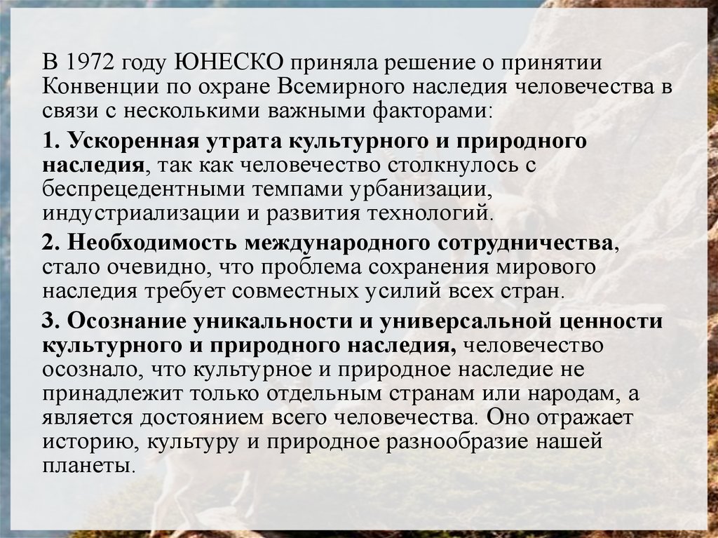 В 1972 году ЮНЕСКО приняла решение о принятииКонвенции по охране Всемирного наследия человечества в